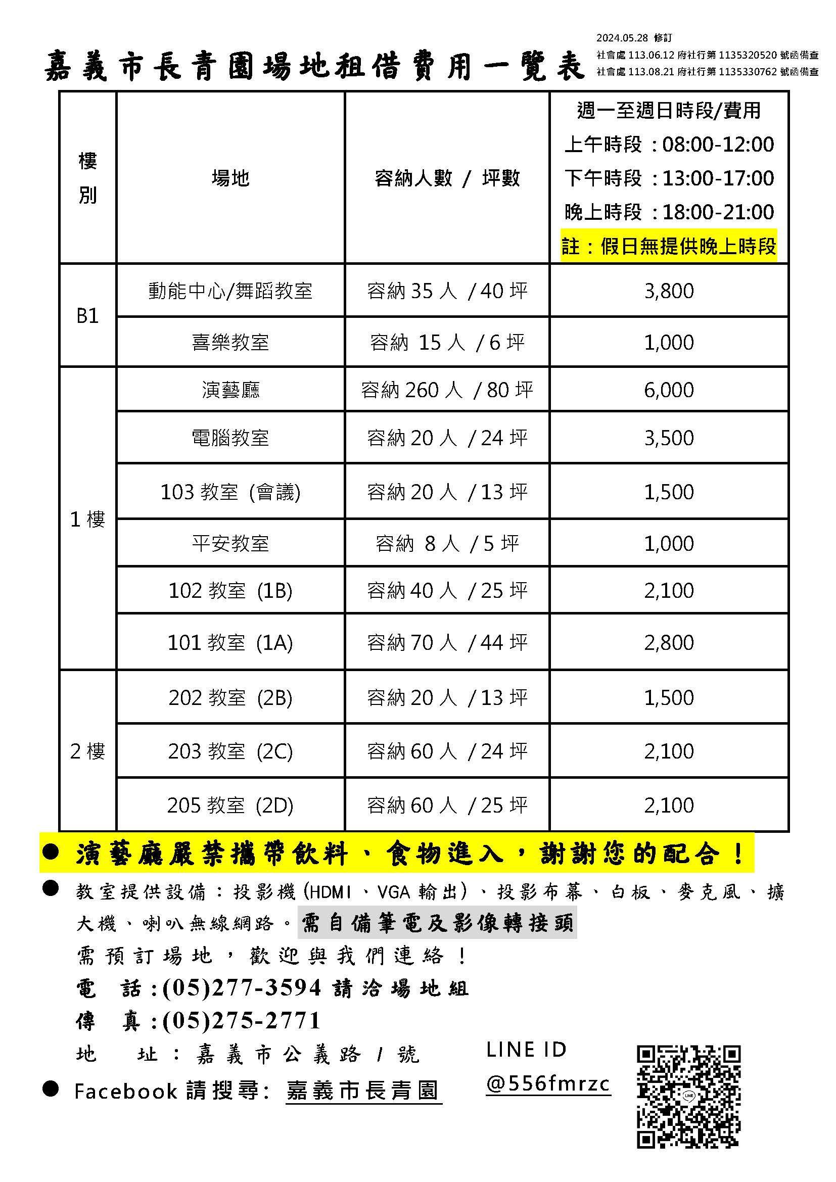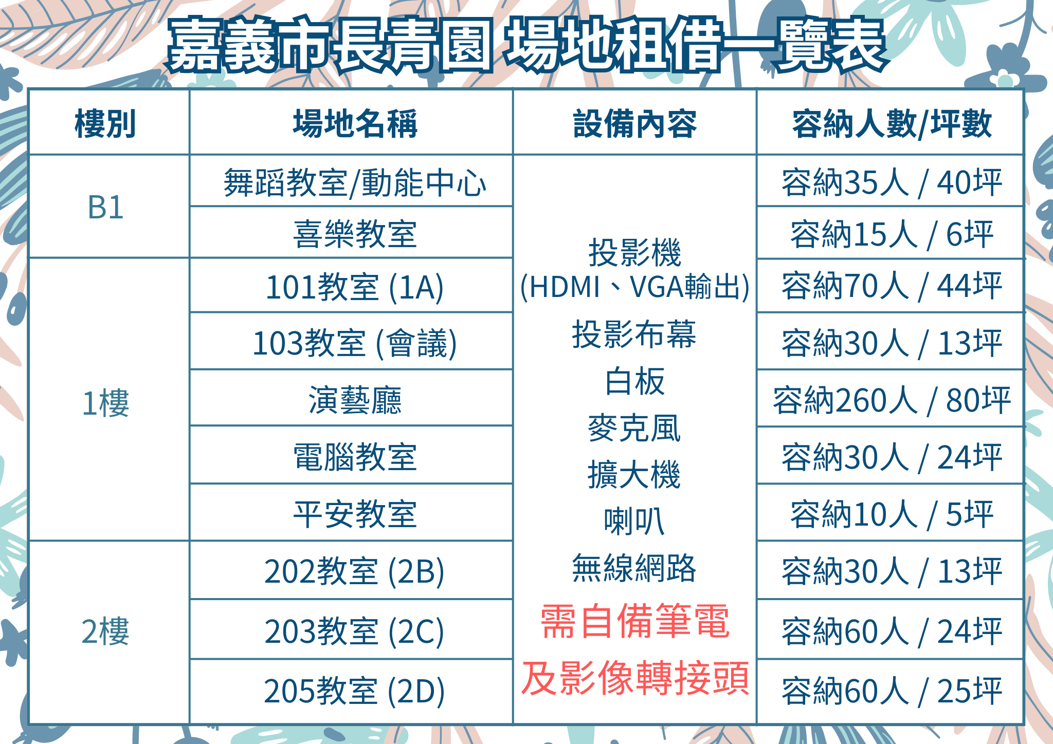 提供教室、演藝廳、電腦教室、舞蹈教室、周邊商店、攤位等場地租借,彈性空間滿足多種會議活動型態。
