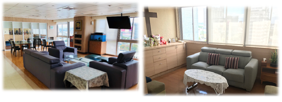 安寧病房公共區域著重以家為概念的病房環境設計,設有可提供病人會客之客廳、餐桌椅、會談休息室,並有可供家屬準備膳食配膳室。硬體空間:專屬會議/圖書室,多功能活動室(會談、禱告、休息),安息室,交誼廳,餐廳,廚房。