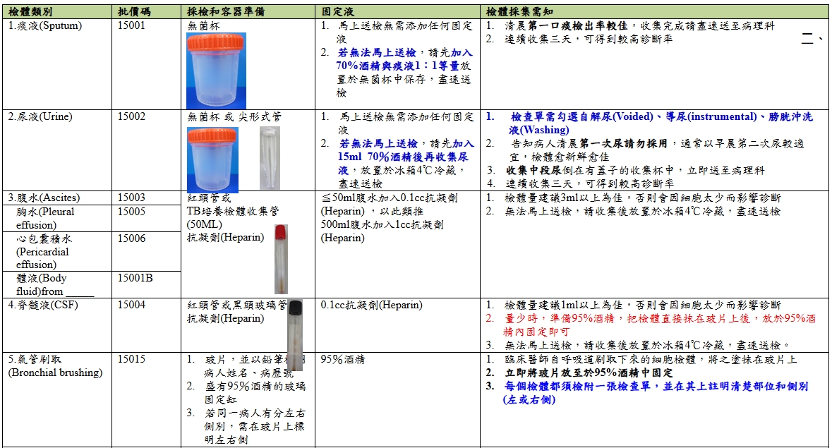 3.檢體資訊:送檢件數、臨床診斷或簡要病史;若醫師認為有特殊需求時,可在檢查單上加以註明