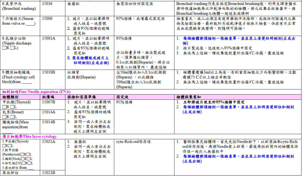 - 每個檢體都須檢附一張檢查單,並在其上註明清楚部位和側別,且與檢體瓶或玻片上內容相符