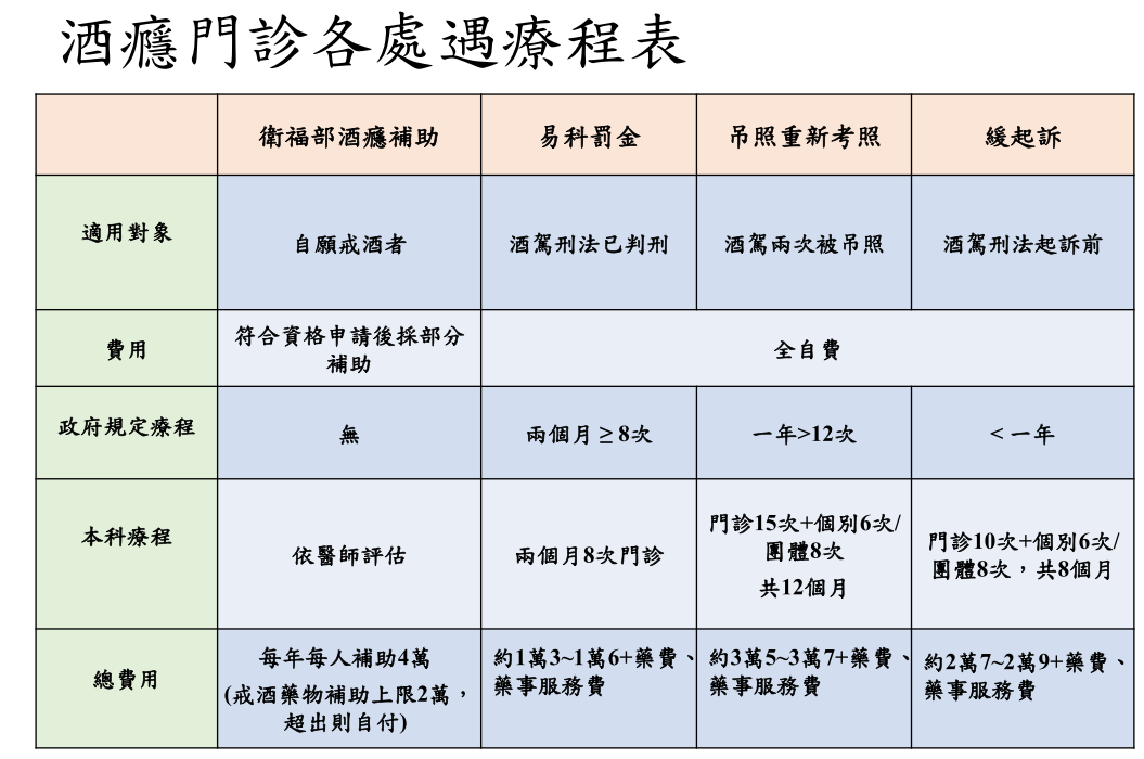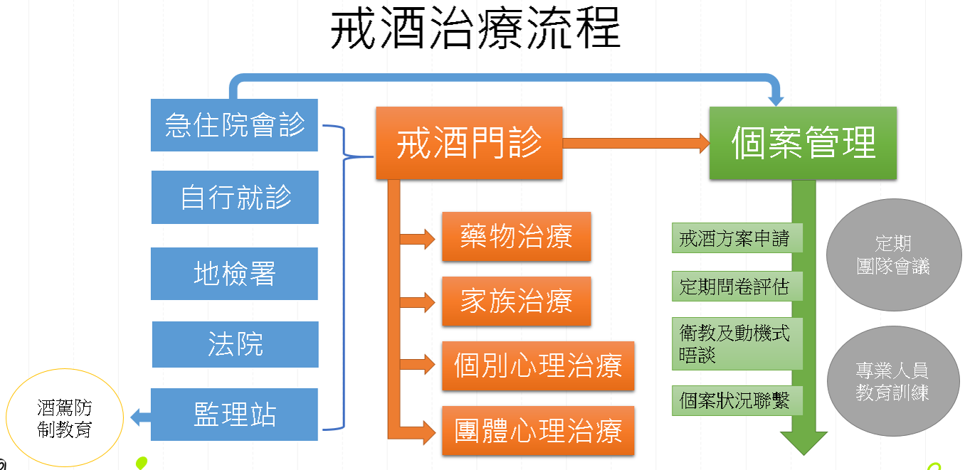 3.藥酒癮防治方面,藥酒癮個案多伴隨經濟、就業問題無法接受配合完整戒癮治療,為協助藥、酒癮患者逐步戒除藥物或酒精依賴,恢復正常生活、重新融入社會,對內增進醫療人員藥酒癮戒治專業人員專業繼續教育訓練;對外提供臨床服務,本中心藉由個案管理師整合專業資源及諮詢專線並提供完整服務。