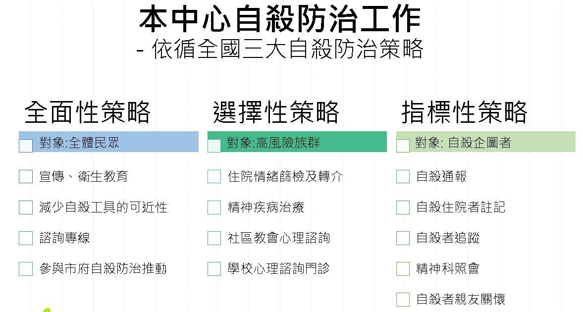 1.對內:急診及住院病人自殺風險評估及介入、增進醫療人員自殺防治專業知識及技能、整合全院自殺防治策略。