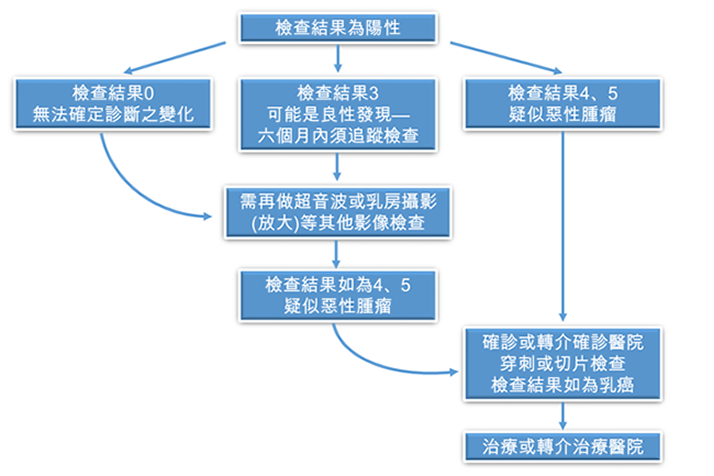 如乳房攝影檢查結果異常時,應儘速找到有經驗的專科醫師,安排進一步檢查,如乳房超音波及細針抽吸細胞或組織切片檢查,以確定是否為乳癌。