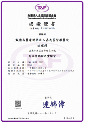 除了病理診斷的臨床工作外,也積極參加臨床討論會,和臨床醫師的研究合作並做為臨床醫師諮詢的對象,以提升本院的醫療品質。另通過財團法人全國認證基金會(TAF)ISO 15189醫學實驗室認證(認證編號3254)、台灣病理學會分子病理實驗室認證及解剖病理專科醫師訓練醫院認定。