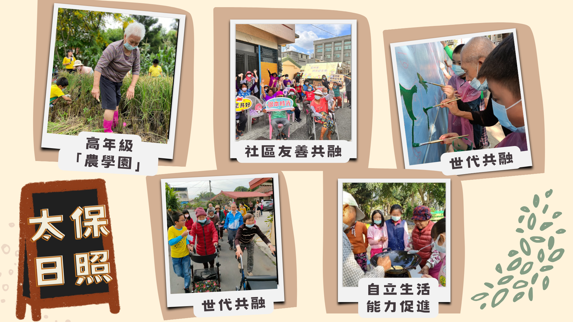 透過活動安排及機能訓練,維護或提升失能者及身障者日常生活功能,減緩因失能產生之照顧依賴,促進其自主能力。安排生活自立促進、讓長者在日照裏保有自主自立生活能力;結合週邊社區資源,新埤國小、社區友善據點讓日照長者活躍於社區中,日照機構扮演促進社區融合及社區共同的橋樑,與社區之間達成共好、共生的交流,打造無齡世代社區照顧服務模式。