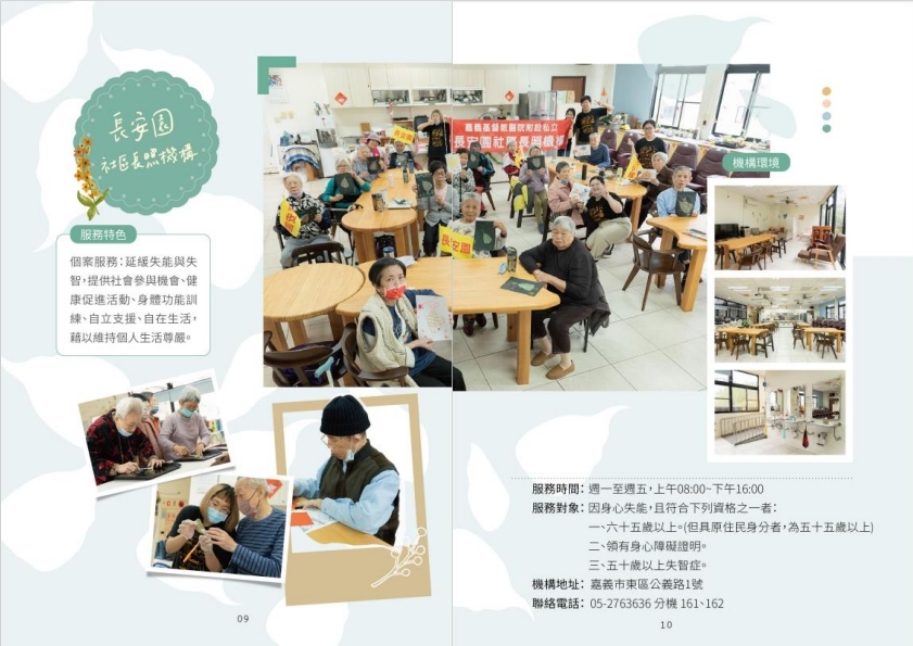 個案服務:延緩失能與失智,提供社會參與機會、健康促進活動、身體功能訓練、自立支援、自在生活,藉以維持個人生活尊嚴。