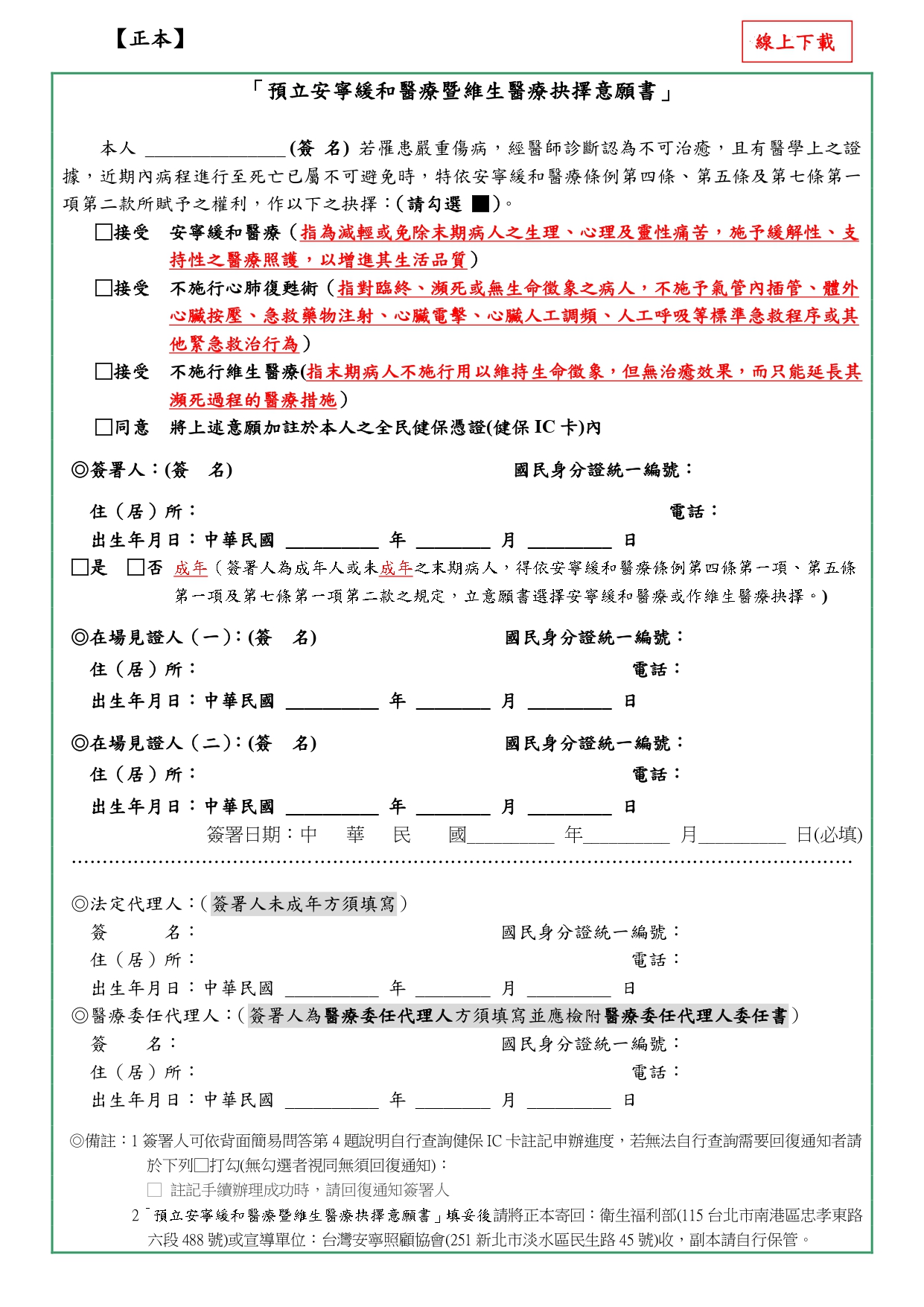 簽署人親自簽名填妥「預立安寧緩和醫療暨維生醫療抉擇意願書」正本,且填妥兩位見證人資料,並勾選願意將此意願加註於健保IC卡上(不可代簽),寄回原索取之醫院或台灣安寧照顧協會即可,工作人員將會彙整相關資料送至衛生福利部登錄小組完成加註事宜。