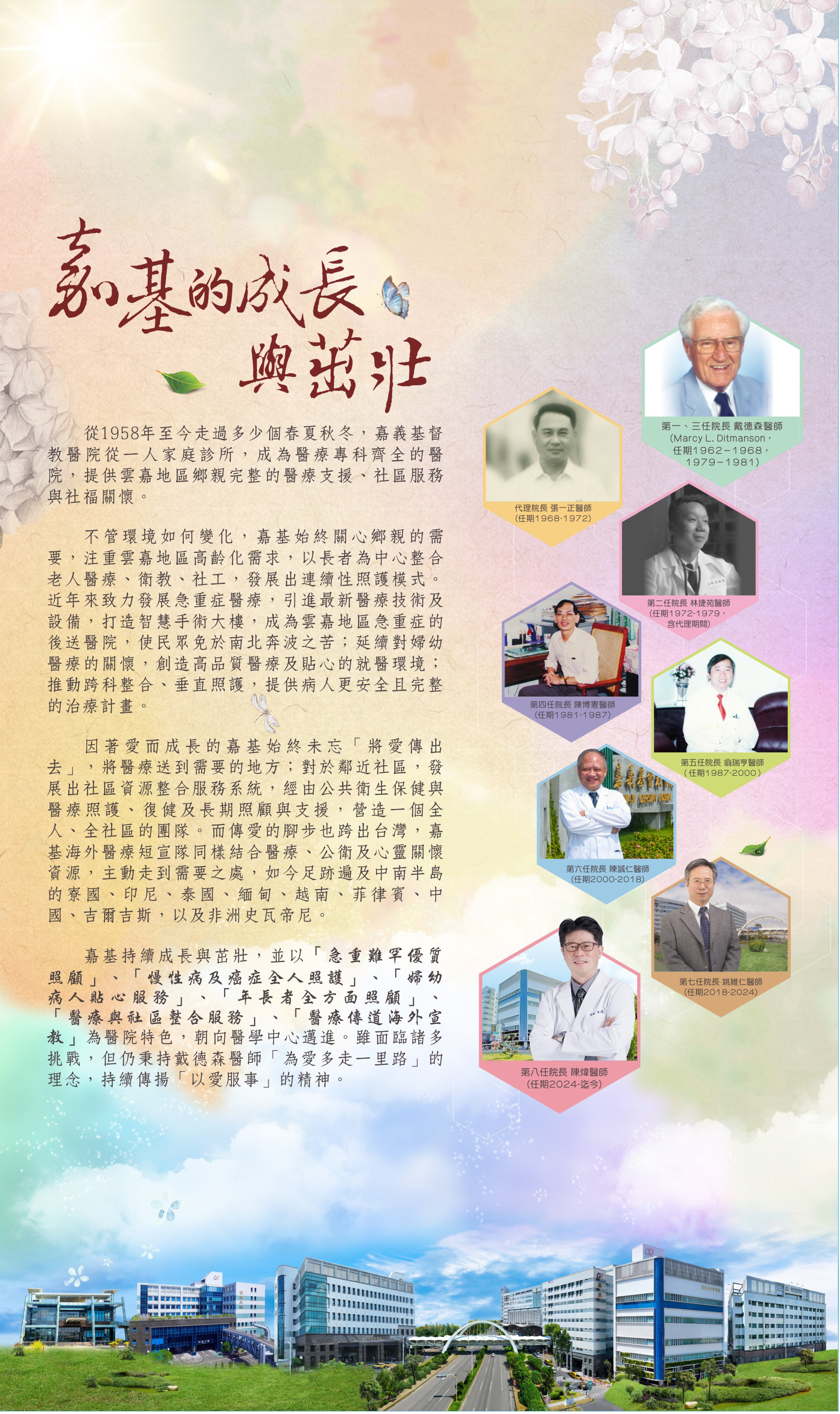 從1958年至今走過多少個春夏秋冬,嘉義基督教醫院從一人家庭診所,成為醫療專科齊全的醫院,提供雲嘉地區鄉親完整的醫療支援、社區服務與社福關懷。