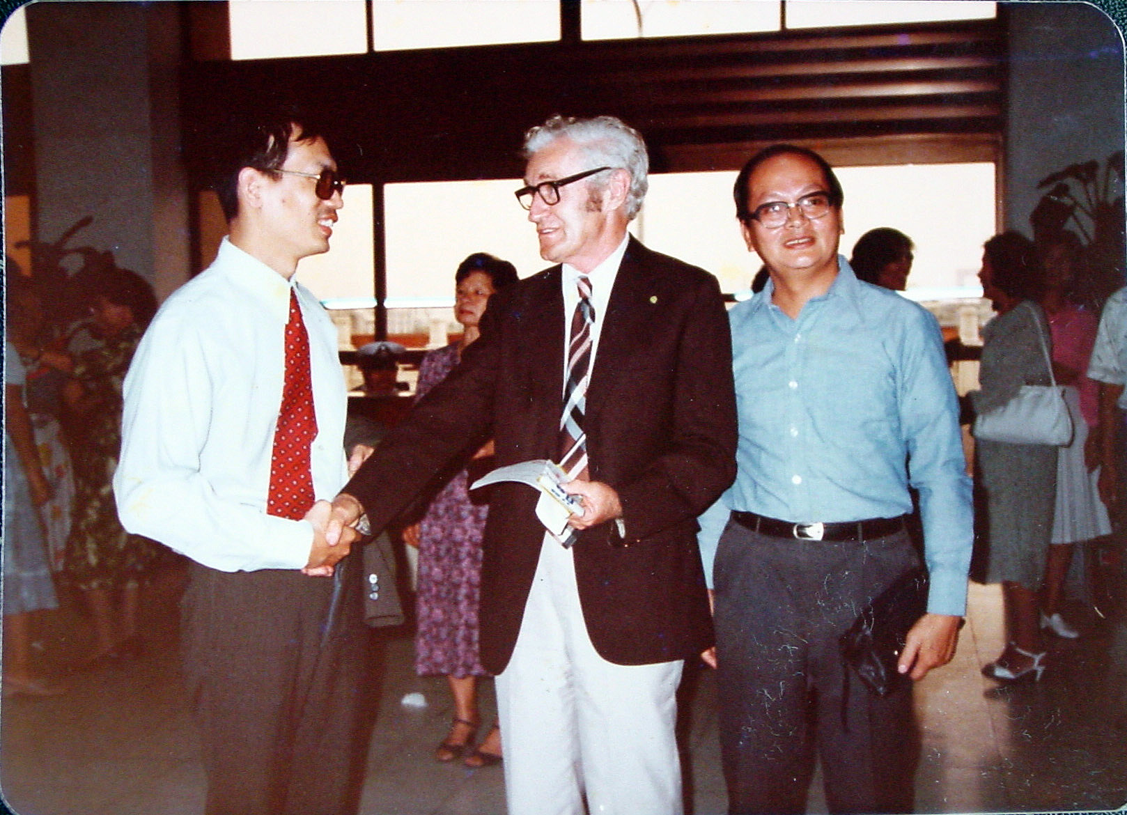 1981年11月5日離台前戴德森醫師與陳博憲院長互道珍重再見,右一為謝奇麗牧師。