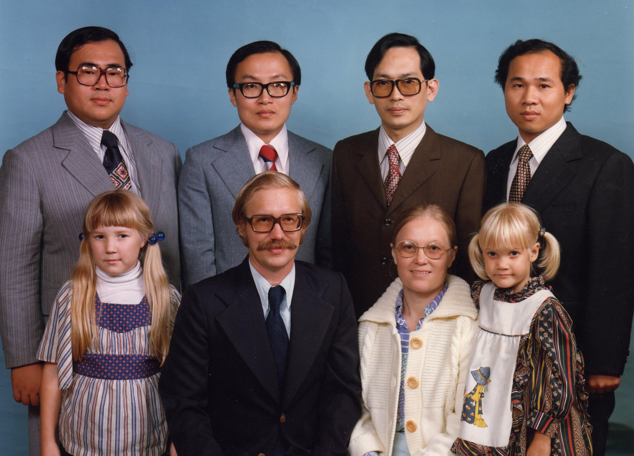 1979 年倪醫師全家返美前與嘉基兒科醫師的合影。(前排左起長女Jennifer、倪安華、倪愛蓮、次女Renee,後排左起林永豐、顏福源、陳博憲、林恆文。