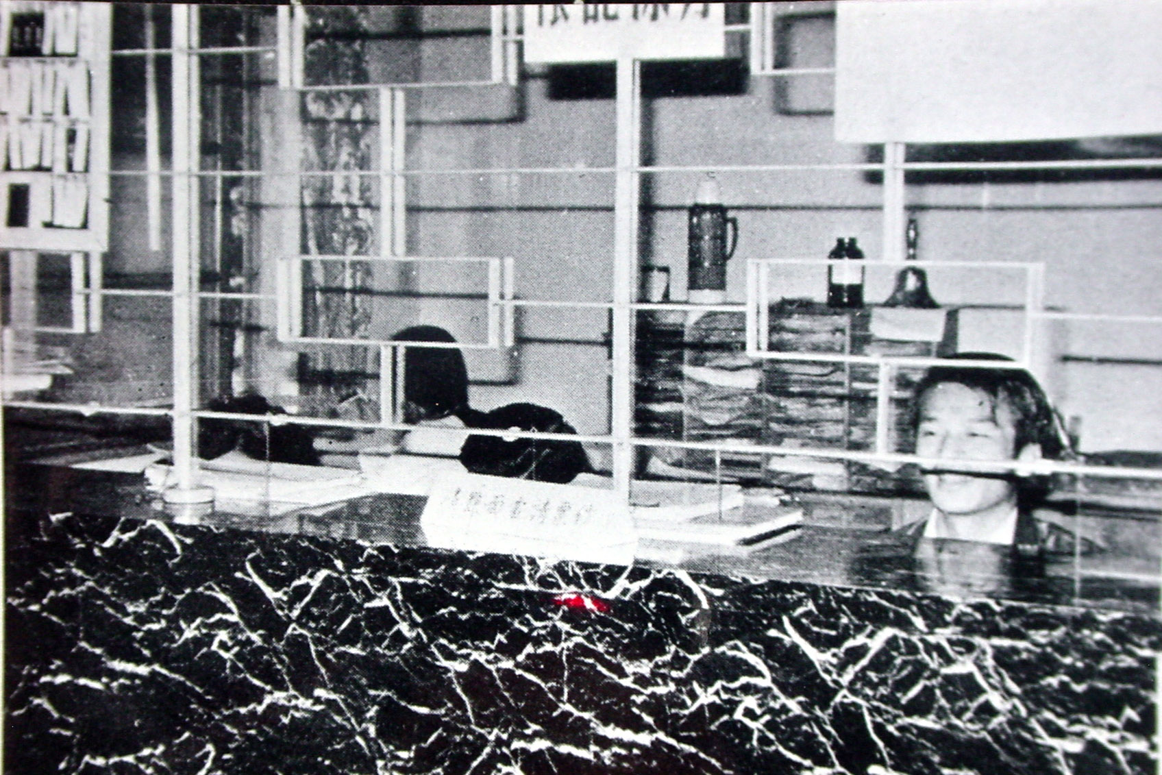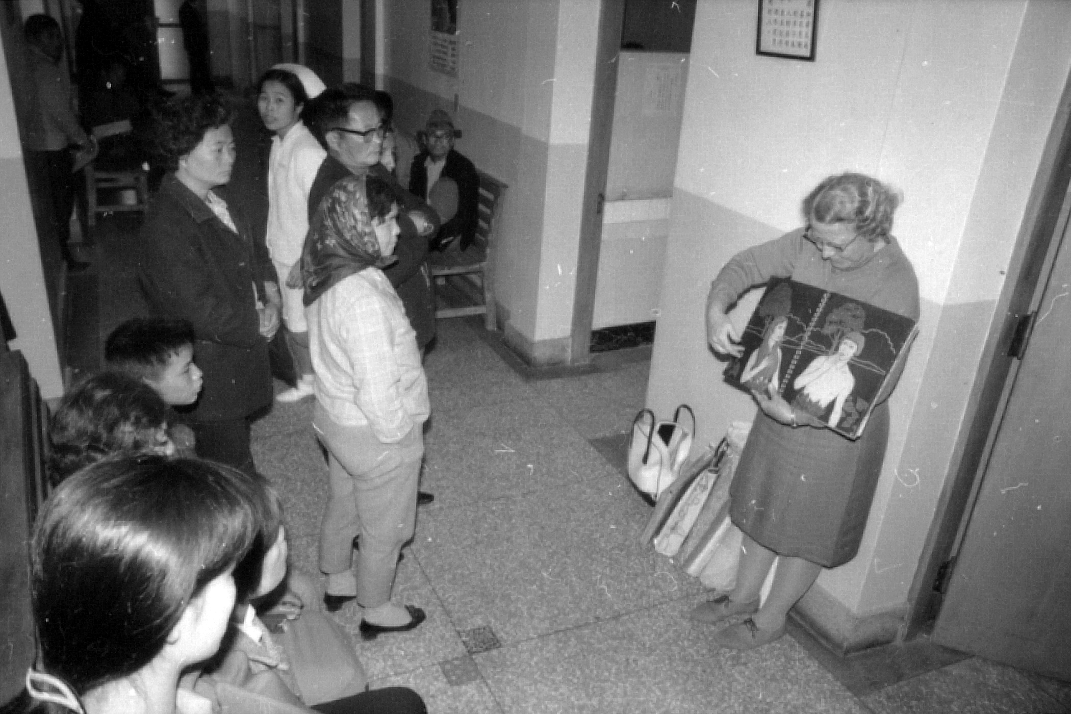 左:1970年代安得生(Eleanor Anderson)教士在門診等候區,以法藍絨傳講「亞當與夏娃偷吃禁果」的聖經故事。