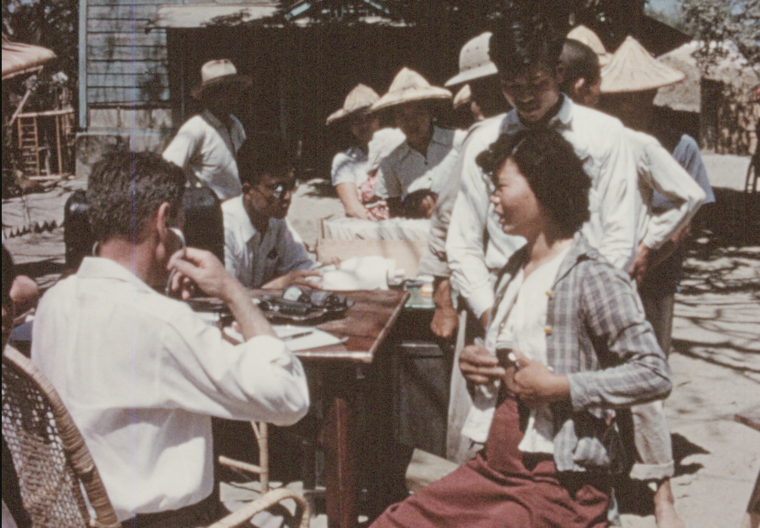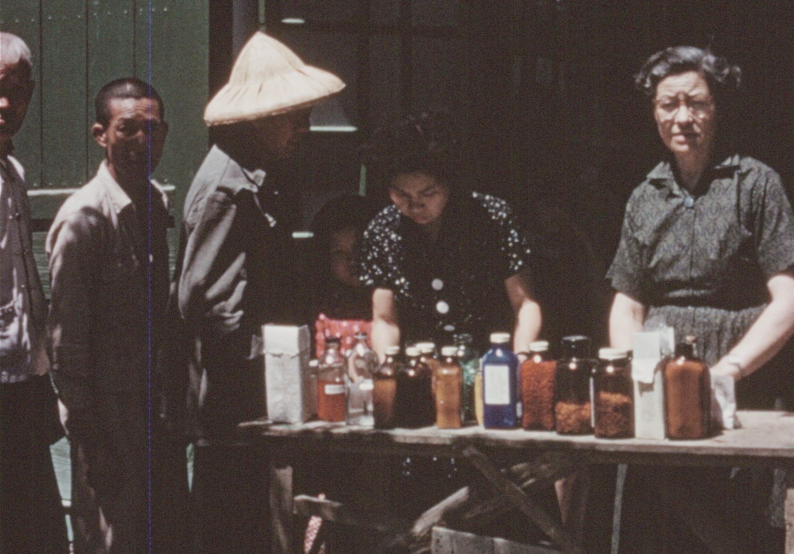 右:巡迴醫療發藥處,張滿護士(中)核對戴德森醫師開立的處方箋,柯洛克教士協助配藥(右一)。