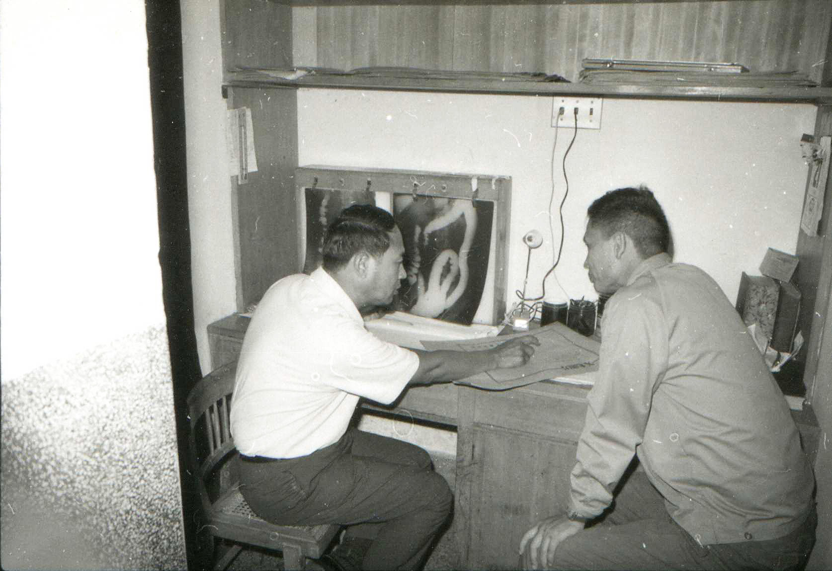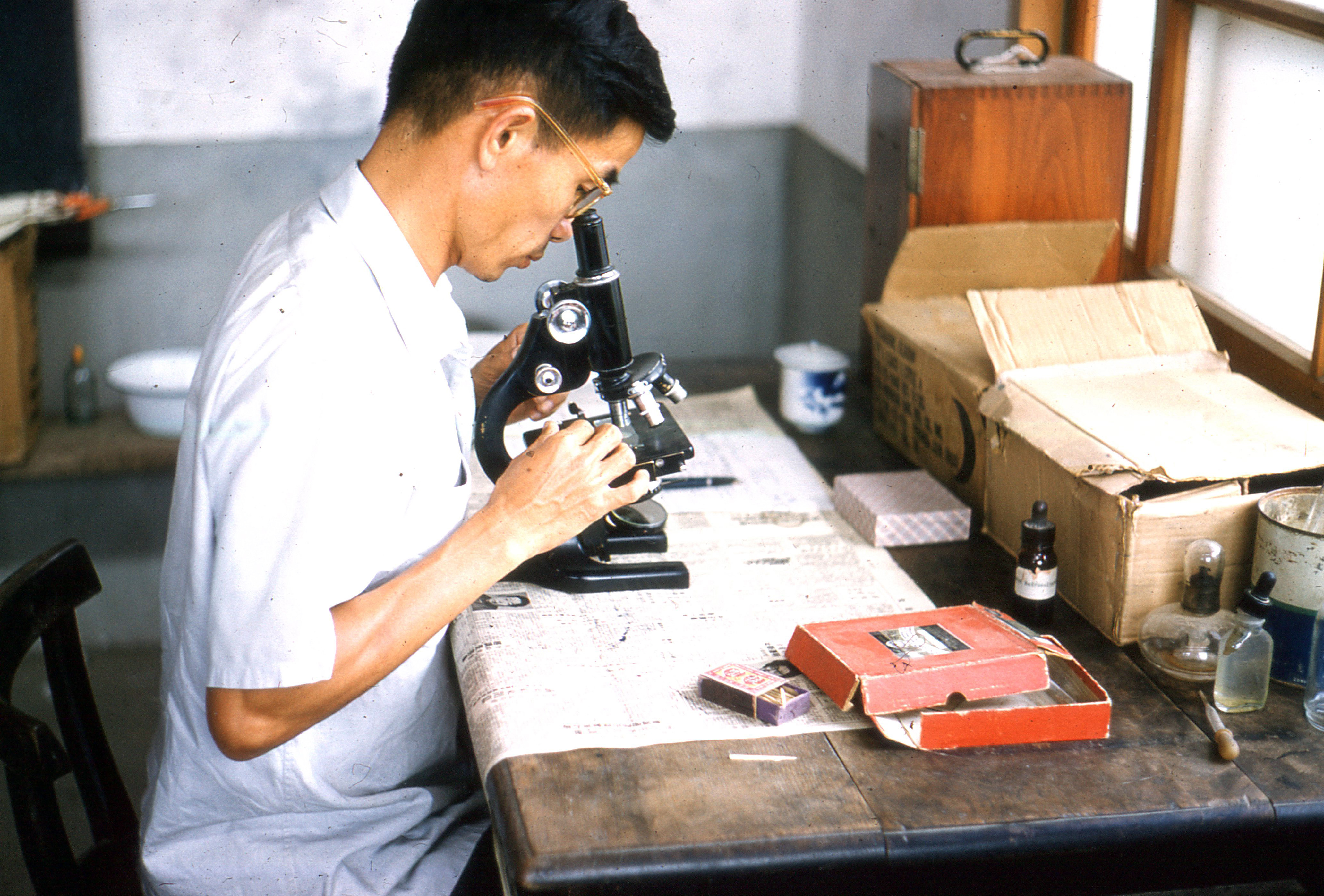 左:1962年,林慶和先生在忠孝路臨時診所二樓執行檢驗工作的情景。