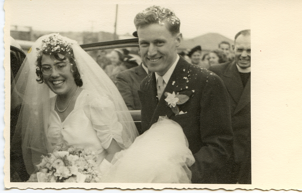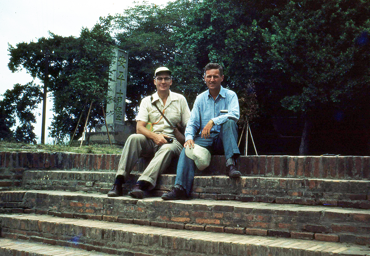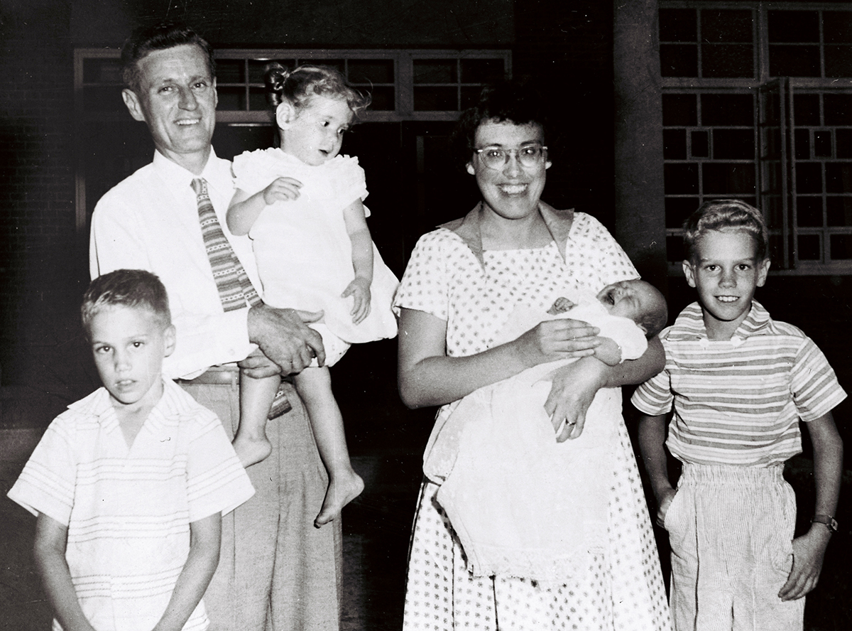 左:1948年5月22日,戴德森與司榮寶在澳洲墨爾本舉行婚禮。中:1957年戴德森(右一)進行環島考察,停留臺南留影於安平古堡前。右:1958年8月,戴德森與司榮寶夫婦以及四個年幼子女抵達嘉義,正式開啟戴德森醫師在嘉義的醫療事工。