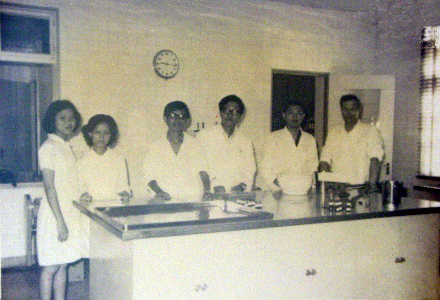 1970年代的嘉基藥劑科團隊,左起:陳淑勉、郭月桂、高瑞禧、張耿端、許銘端、閔克難