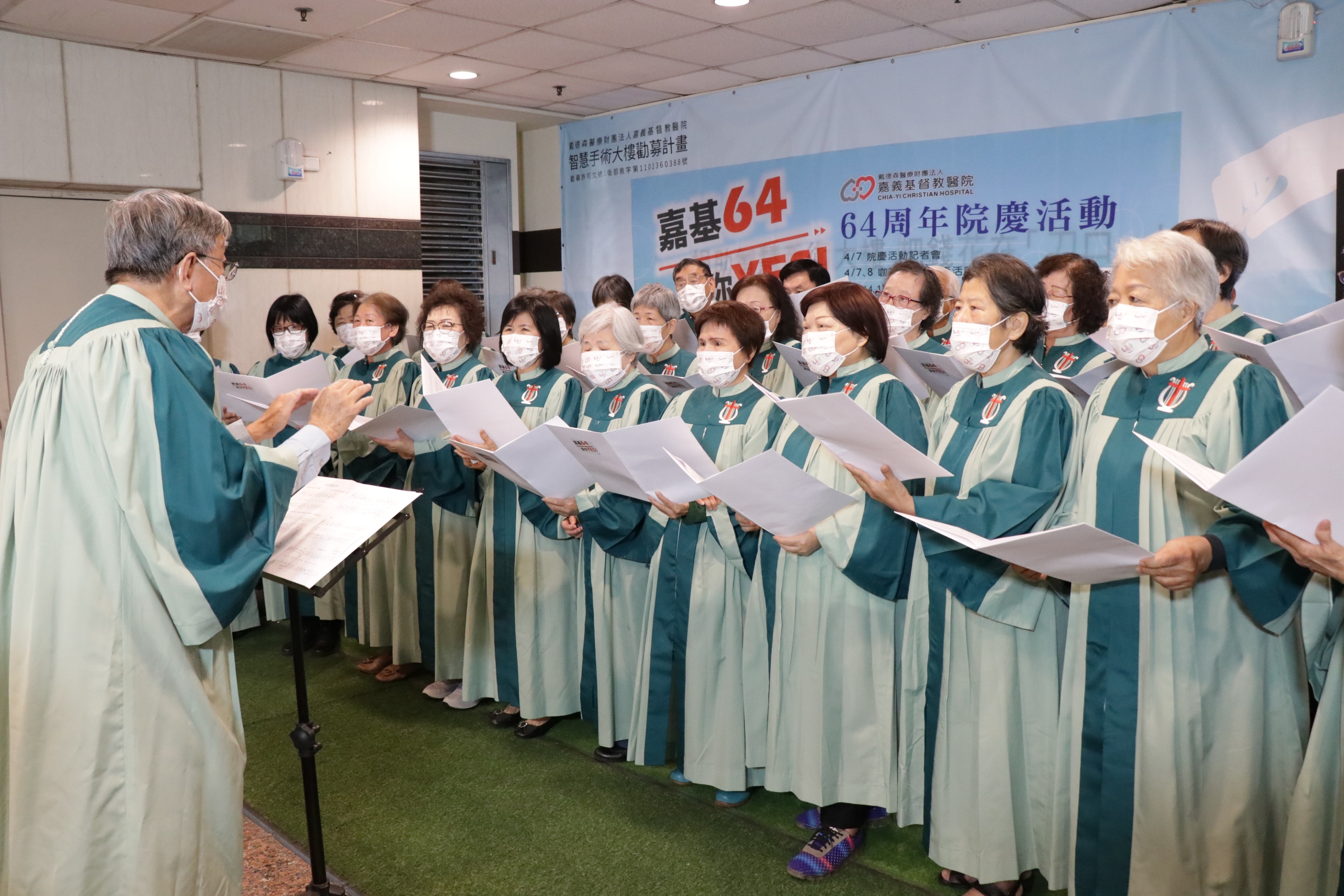 2022年嘉基64院慶活動,退休員工自組詩班歌頌主恩,由張耿端擔任指揮