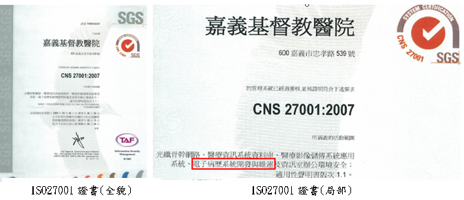 本院於民國98年6月通過ISO 27001資訊安全認證,認證內容包括:光纖骨幹網路、醫療資訊系統資料庫、醫療影像系統應用系統、電子病歷系統開發與維運及資訊室辦公環境安全。並落實資安稽核,確實保障系統安全。
