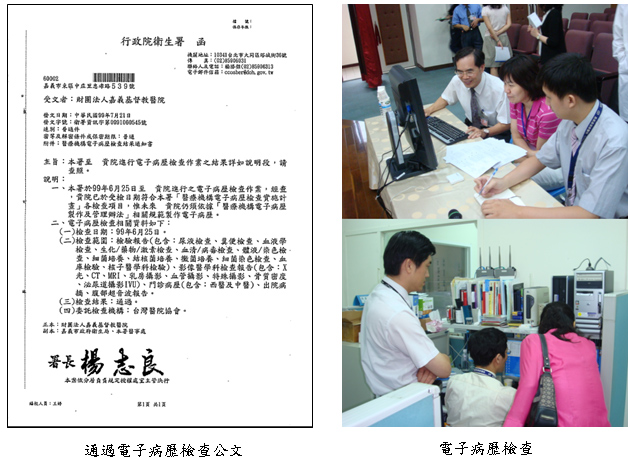 針對電子病歷相關安全規定,本院於民國99年6月通過衛生署之電子病歷檢查,符合醫療機構電子病歷製作及管理辦法相關規範,通過範圍包括於99年6月前所宣告的所有項目:檢驗報告(包含:尿液檢查、糞便檢查、血液檢查、生化/藥物/激素檢查、血清/病毒檢查、體液/染色檢查、細菌培養、結核菌培養、黴菌培養、細菌染色檢查、血庫檢驗、核子醫學科檢驗)、影像醫學科檢查報告(包含:X光、CT、MRI、乳房攝影、血管攝影、特殊攝影、骨質密度、泌尿道攝影IVU)、門診病歷(包含:西醫及中醫)、出院病摘、腹部超音波報告。在資料的安全管理上完全符合政府之規定。