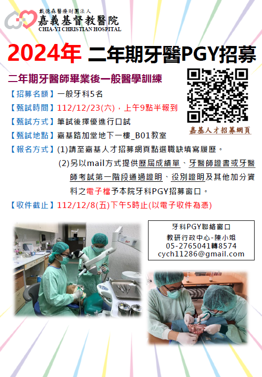 2024年 二年期牙醫PGY招募 (甄試時間112/12/23)