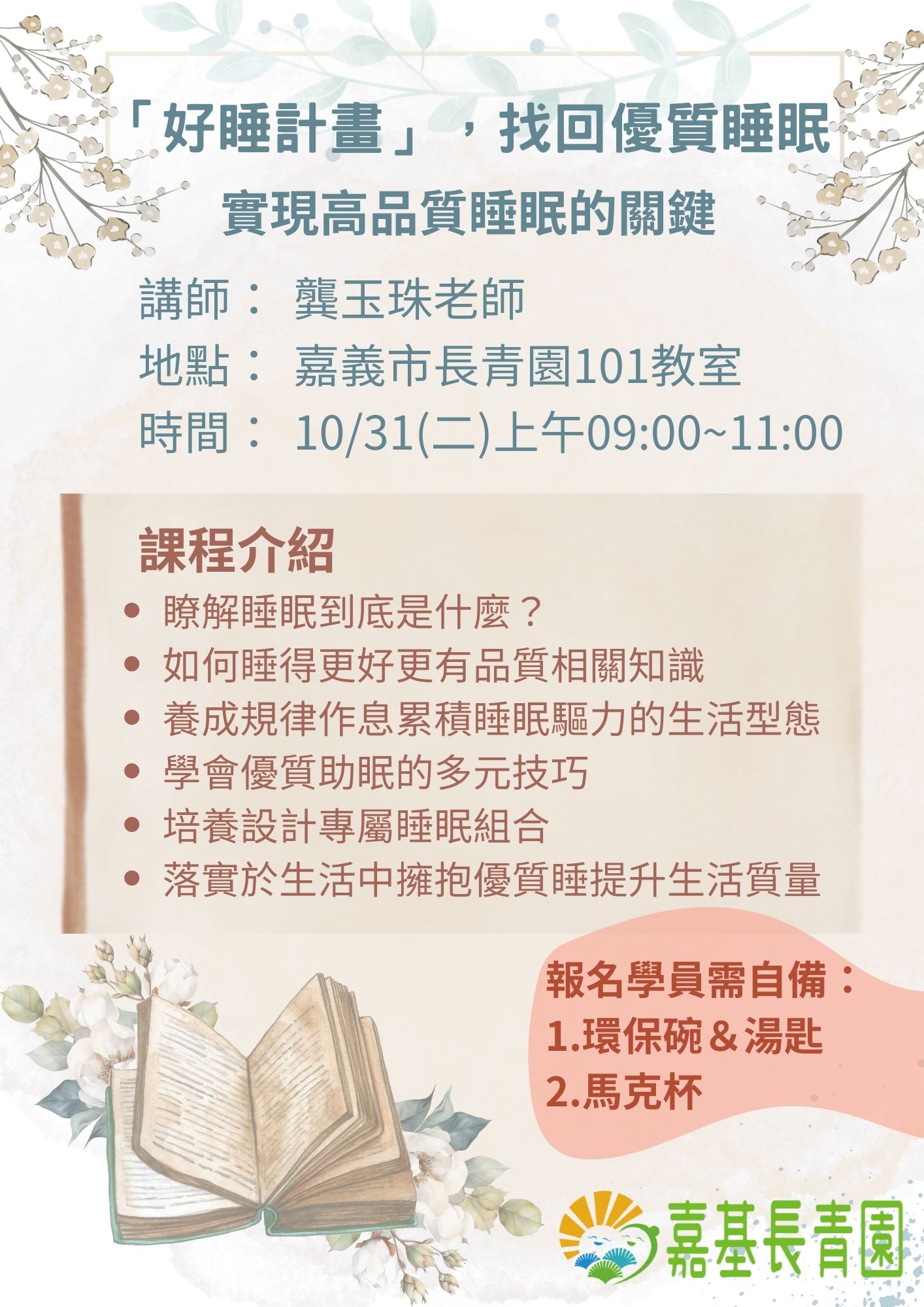 講師:龔玉珠老師地點:嘉義市長青園101教室時間:10/31(二)上午09:00~11:00課程介紹: