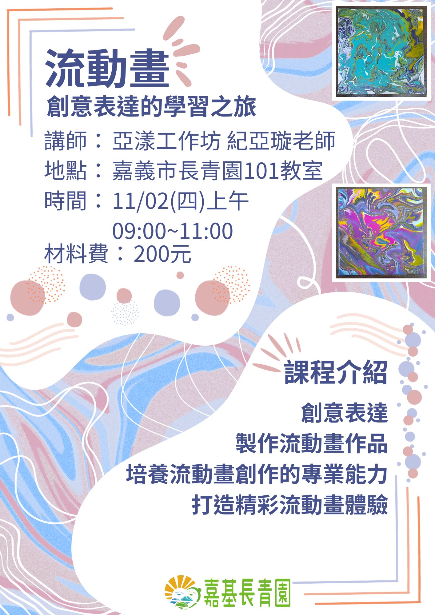 講師:亞漾工作坊 紀亞璇老師地點:嘉義市長青園101教室時間:11/02(四)上午09:00~11:00