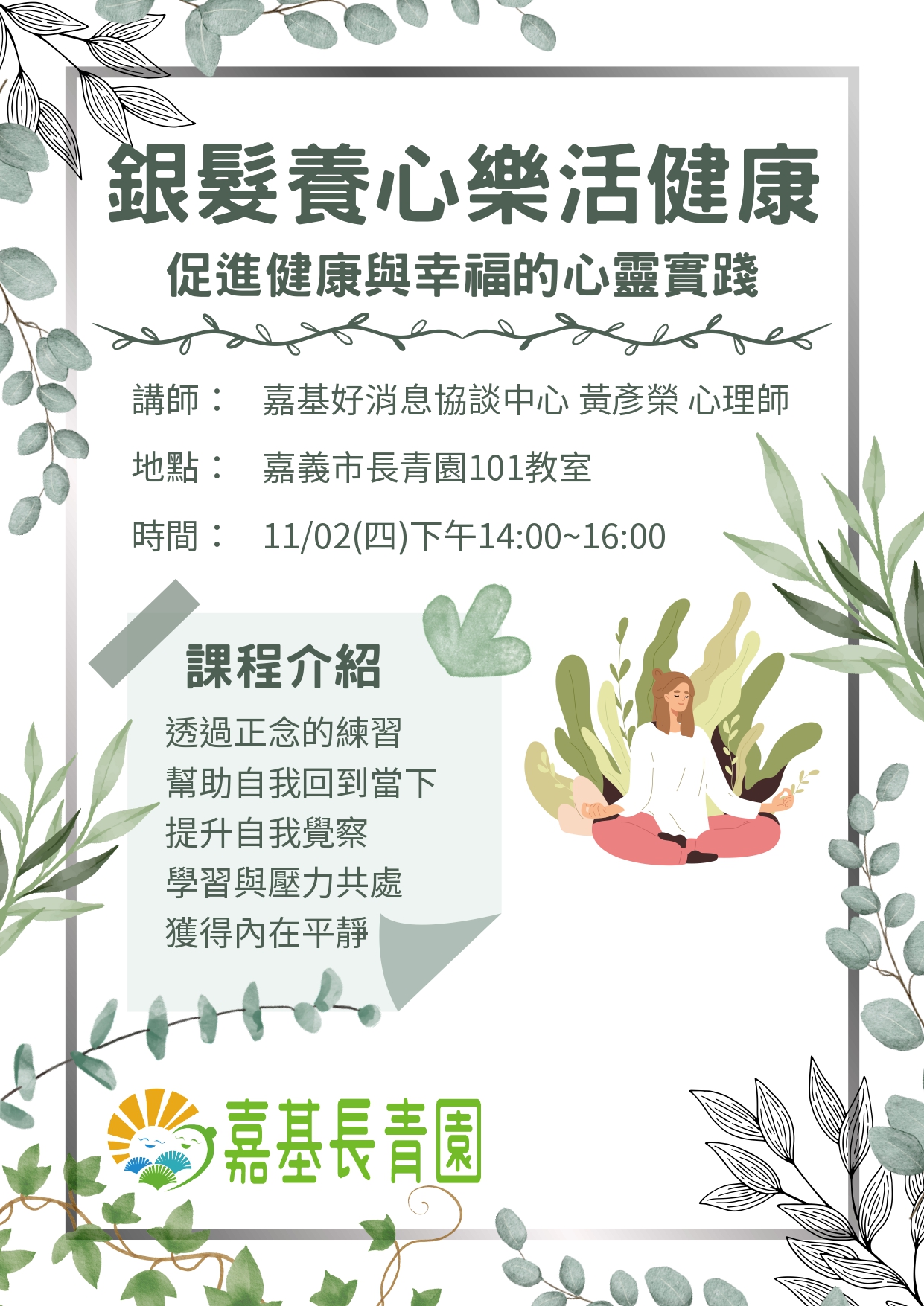 講師:嘉基好消息協談中心 黃彥榮 心理師地點:嘉義市長青園101教室時間:11/02(四)下午14:00~16:00課程介紹: