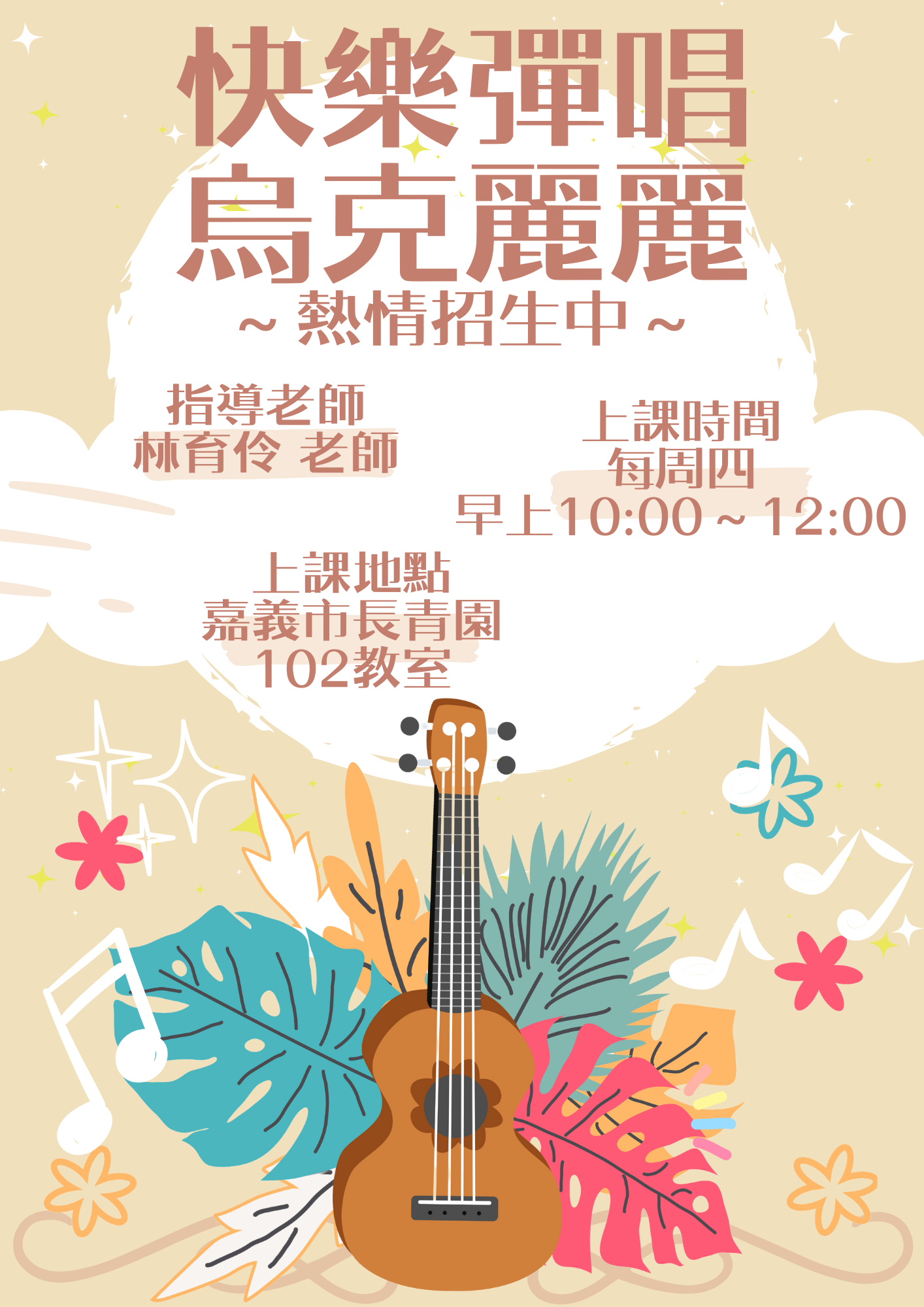 113年度長青學苑課程 快樂彈唱烏克麗麗課 熱烈招生中😊🔎注意事項:個人報名已開始受理報名🙌請於平日上班時間 🕰上午09:00~12:00、下午14:00~17:30到長青園一樓的📍行政辦公室 繳費報名喔❗報名時須攜帶身分證正本,以及學費❗如有任何疑問,也歡迎電洽☎️05-2763636 分機117/111