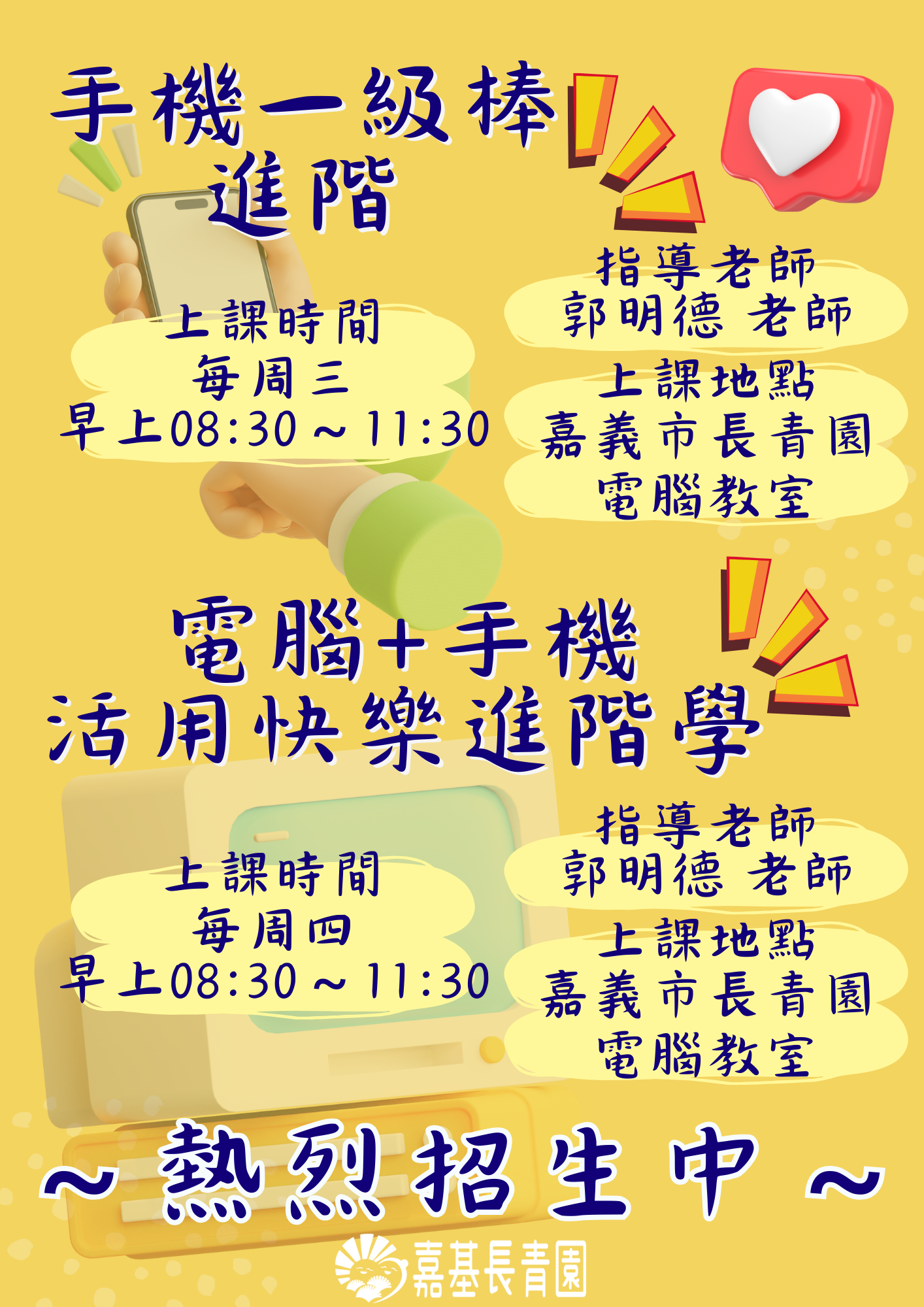 113年度長青學苑 手機一級棒-進階、電腦+手機-活用快樂進階學課程招生