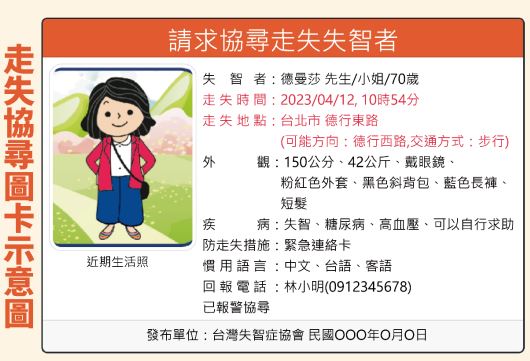 本圖卡生成器由社團法人台灣失智症協會建置,提供一般民眾家中有失智者走失時,可透過本系統製作尋人圖卡,並由協會人員透過相關網路平台刊登進行協尋。