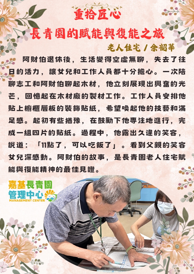 阿財伯退休後,生活變得空虛無聊,失去了往日的活力,讓女兒和工作人員都十分擔心。一次陪聊志工和阿財伯聊起木材,他立刻展現出興奮的光芒,回憶起在木材廠的製材工作。工作人員安排他貼上櫥櫃層板的裝飾貼紙,希望喚起他的技藝和滿足感。雖然起初有些猶豫,但在鼓勵下他專注地進行,完成了一組四片的貼紙。這過程中,他露出久違的笑容,說道:「11點了,可以吃飯了。」