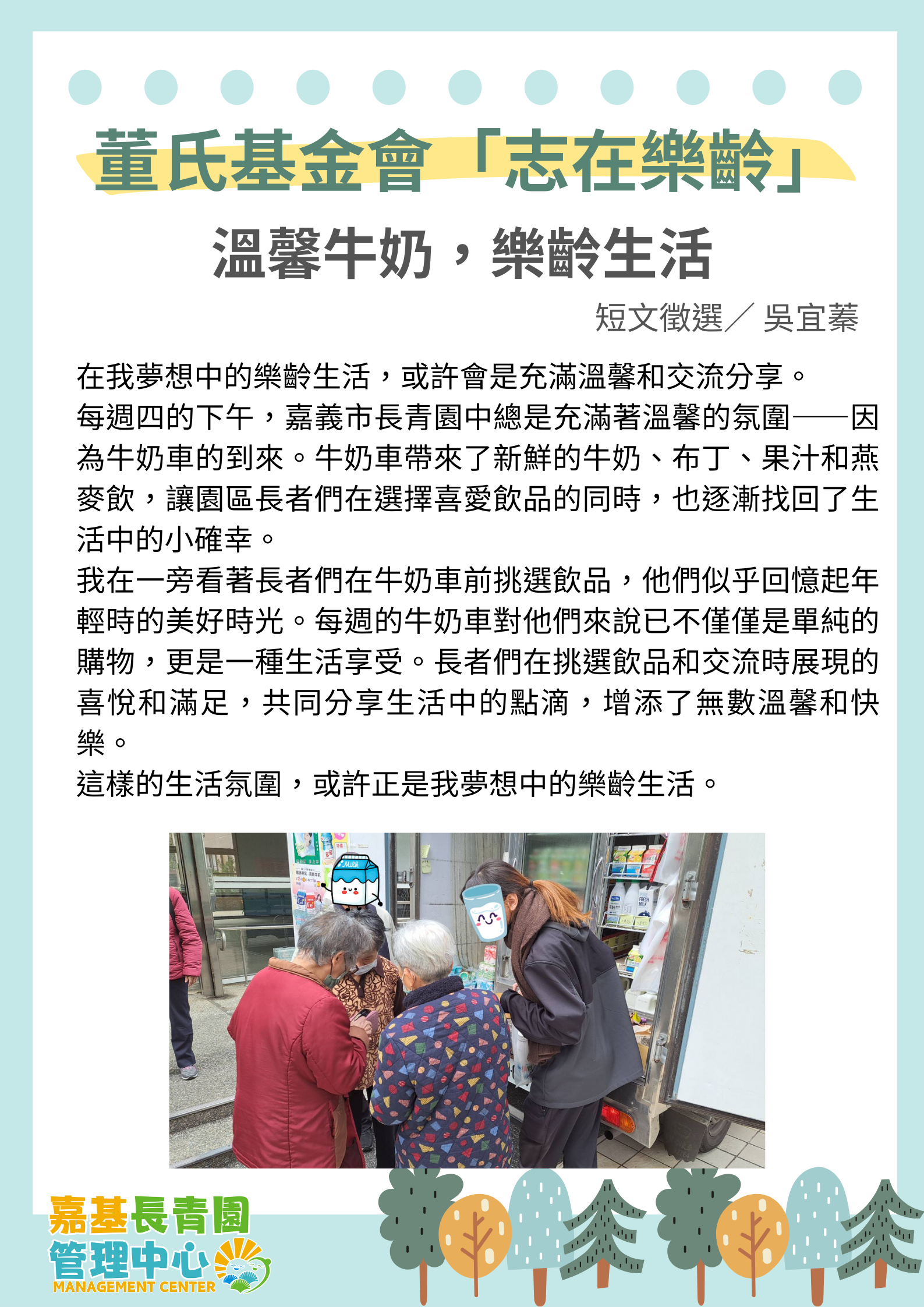 每週四的下午,嘉義市長青園中總是充滿著溫馨的氛圍——因為牛奶車的到來。牛奶車帶來了新鮮的牛奶、布丁、果汁和燕麥飲,讓園區長者們在選擇喜愛飲品的同時,也逐漸找回了生活中的小確幸。