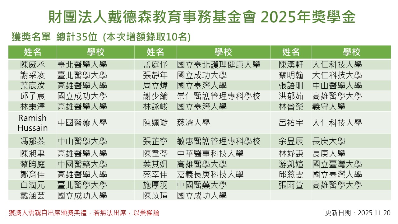 2025年【財團法人戴德森教育事務基金會】獎學金-獲獎名單
